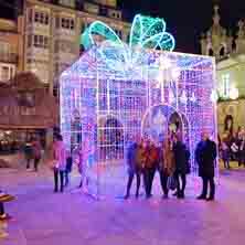 Con sus cinco metros de altura y fabricada con un sistema de iluminación LED RGB, y sus dos entradas para acceder al interior, esta caja regalo es muy llamativa por los cambios de colores automáticos que tiene sincronizados.