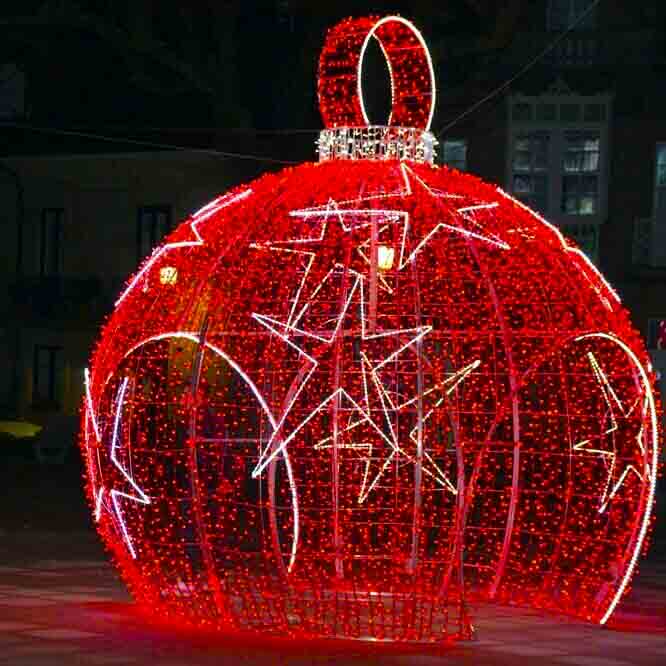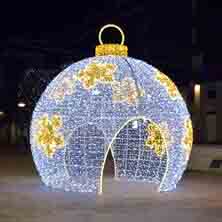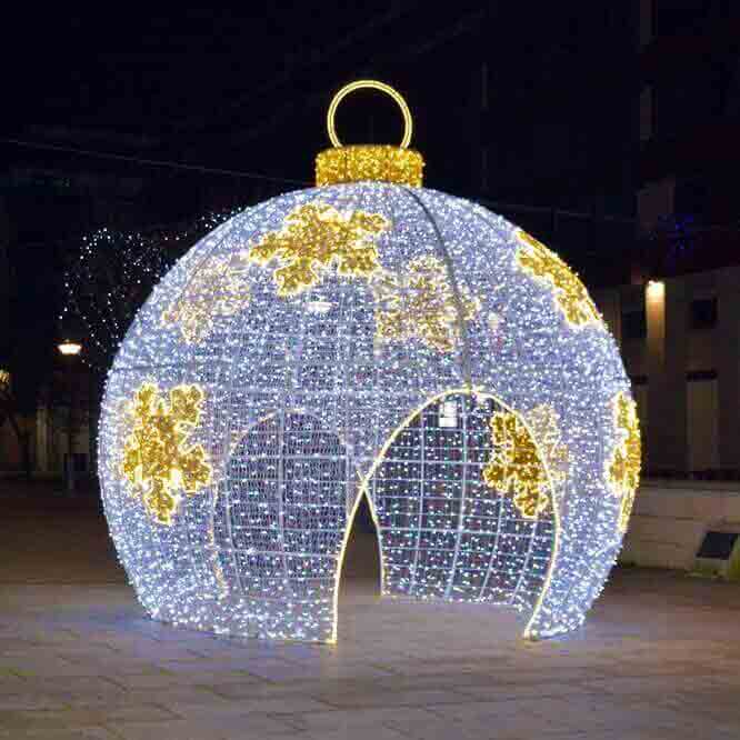 Bola de navidad 3D con unas dimensiones de cinco metros de diámetro y con un sistema de iluminación LED más Fhasing decorada con malla. Tiene acceso al interior con dos entradas bonita para vestir espacios urbanos.
