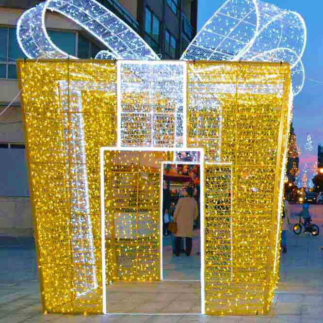 Caja de regalo fabricada en LEDs de alta calidad decorada con sistema de malla, la cual se puede acceder a su interior, ideal para la decoración en espacios urbanos así como en interiores.